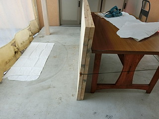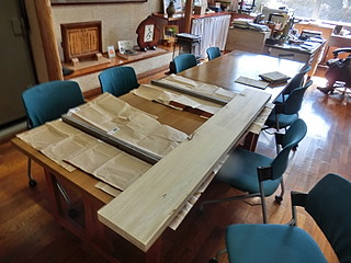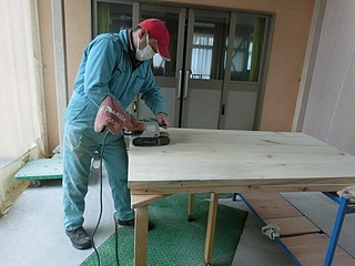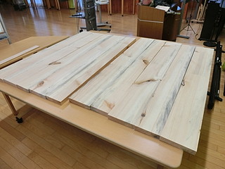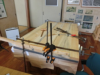 接着後、電動のカンナで削ってからベルトサンダーで平らにする。大きいだけになかなか大変な作業。ここまで一週間くらい。