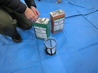 その後仕上げも2度塗り。硬化剤が混ざってから10分程度で全てを塗りおえないと塗料がのびなくなってしまう。かなり厚い塗膜になった。