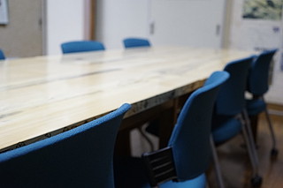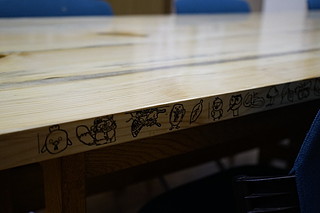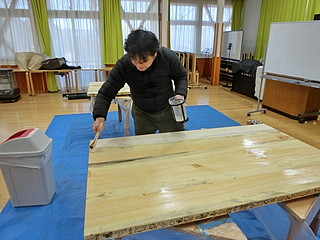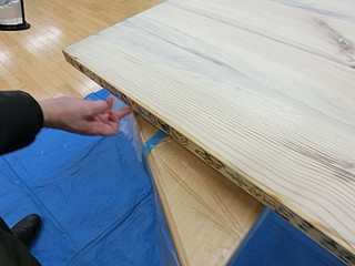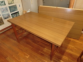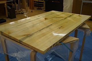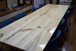 今回差し替えた天板、アカマツ枯れの特徴でアオ(水分が多いのでカビのようなもの)が入っているが、リサイクルの証で評判も悪くない。