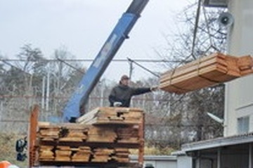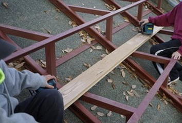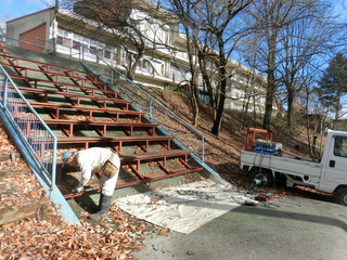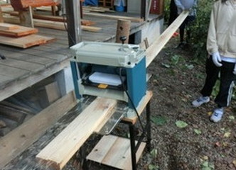 鉄骨を組んでいただいた後、6年生の作業で座板を張っている。 自動カンナ盤で板を削るがやはり重さと機械に合わせての動きをする必要性とで、2枚ほどやって後は先生たちで行った。 今年度購入した、マキタのランダムオービットサンダーで表面を削り、カンナで面取りをする。 ストックした材料を使ったので、補充のために今年度伐採した赤松を製材して納めてもらう。 公民館運営委員長さんには、さらに上下の階段部分を後から取り付けていただいた。 春までには製作を終えて、お披露目になる予定。