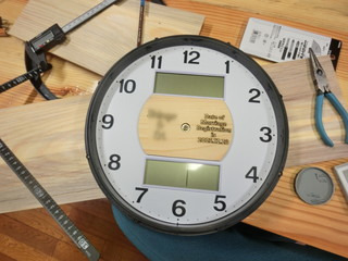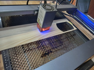 土日の学校で少し作業を行った記録 この時期に、本校の先生が立て続けに入籍をされた。めでたいので時計に入籍日をレーザー彫刻して贈ることにした。 文字盤は白だったので、木を薄く削ってレーザー加工機で作業した。 校長室のテレビ前にいろんな贈り物がたまってきたので、テレビの上に台を付けることにした。 元々、3Dプリンタで作った固定用のアームがあるので、その上に載せるだけにして、板を加工。 下がすっきりした分、全体の見ためは賑やかになった。